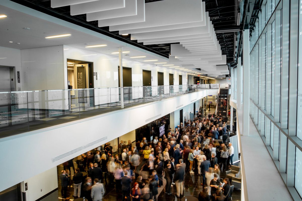 Notre hall principal, entièrement vitré sur deux niveaux, peut accueillir plus de 3 500 personnes et offre un accès direct à toutes les salles du rez-de-chaussée.